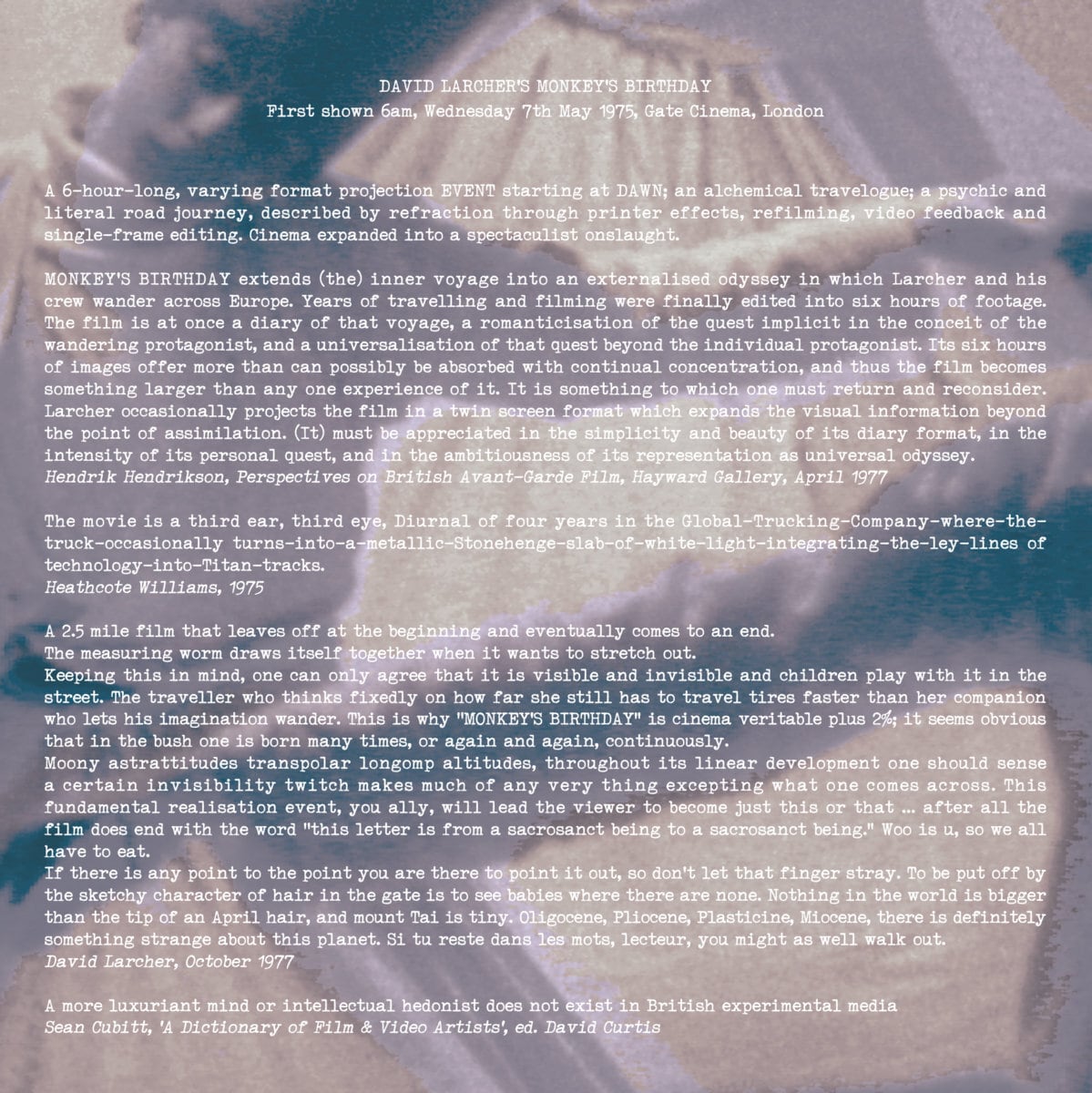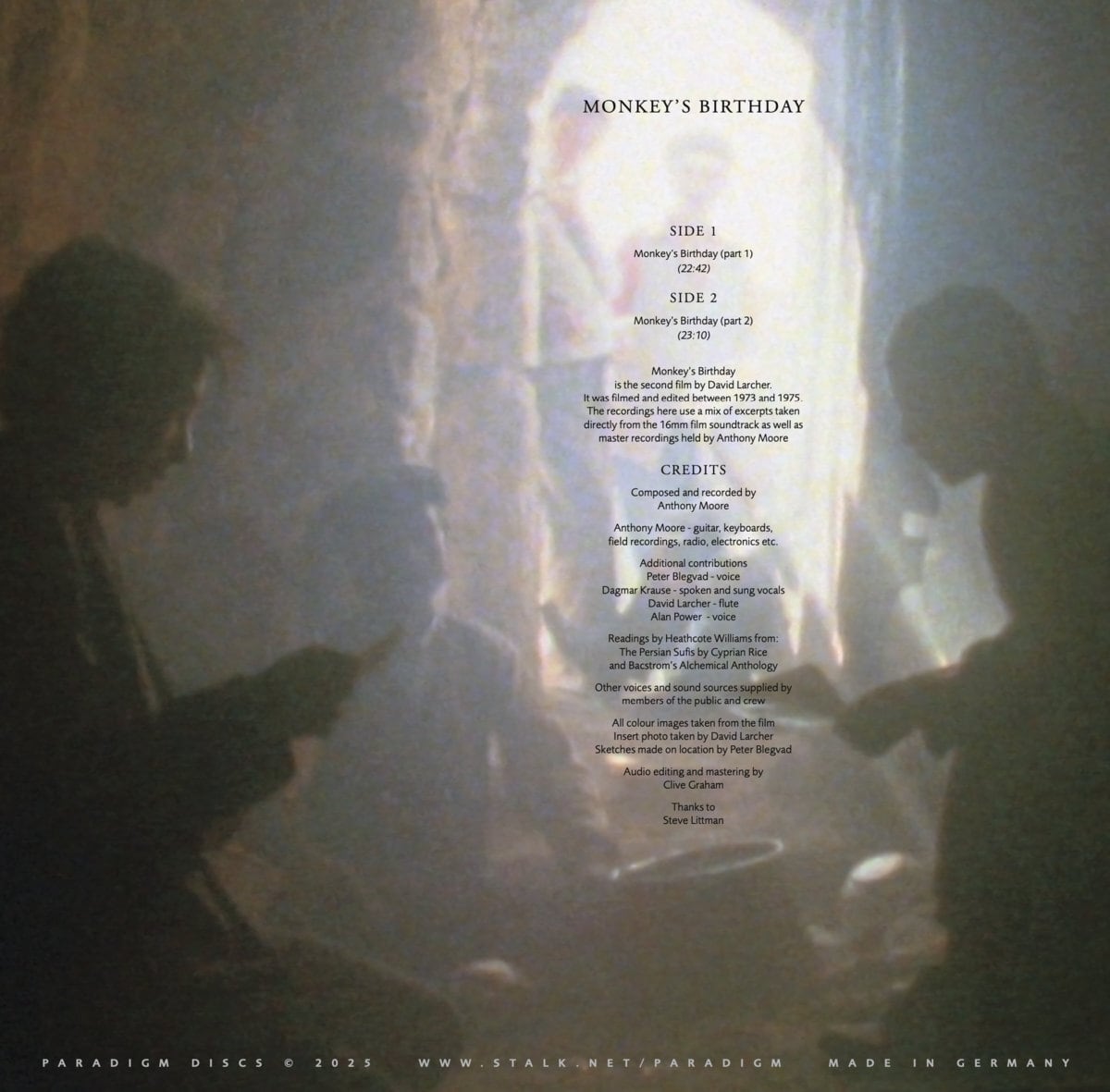アンソニー・ムーアの旧友でスラップ・ハッピーやアンソニー・ソロ作のジャケット写真を手掛けた映像作家/写真家デヴィッド・ラーチャー(2023年死去)による6時間に及ぶエクスペリメンタル・ロード・ムービー『Monkey's Birthday』のサウンドトラックのためにアンソニーが制作した音源。