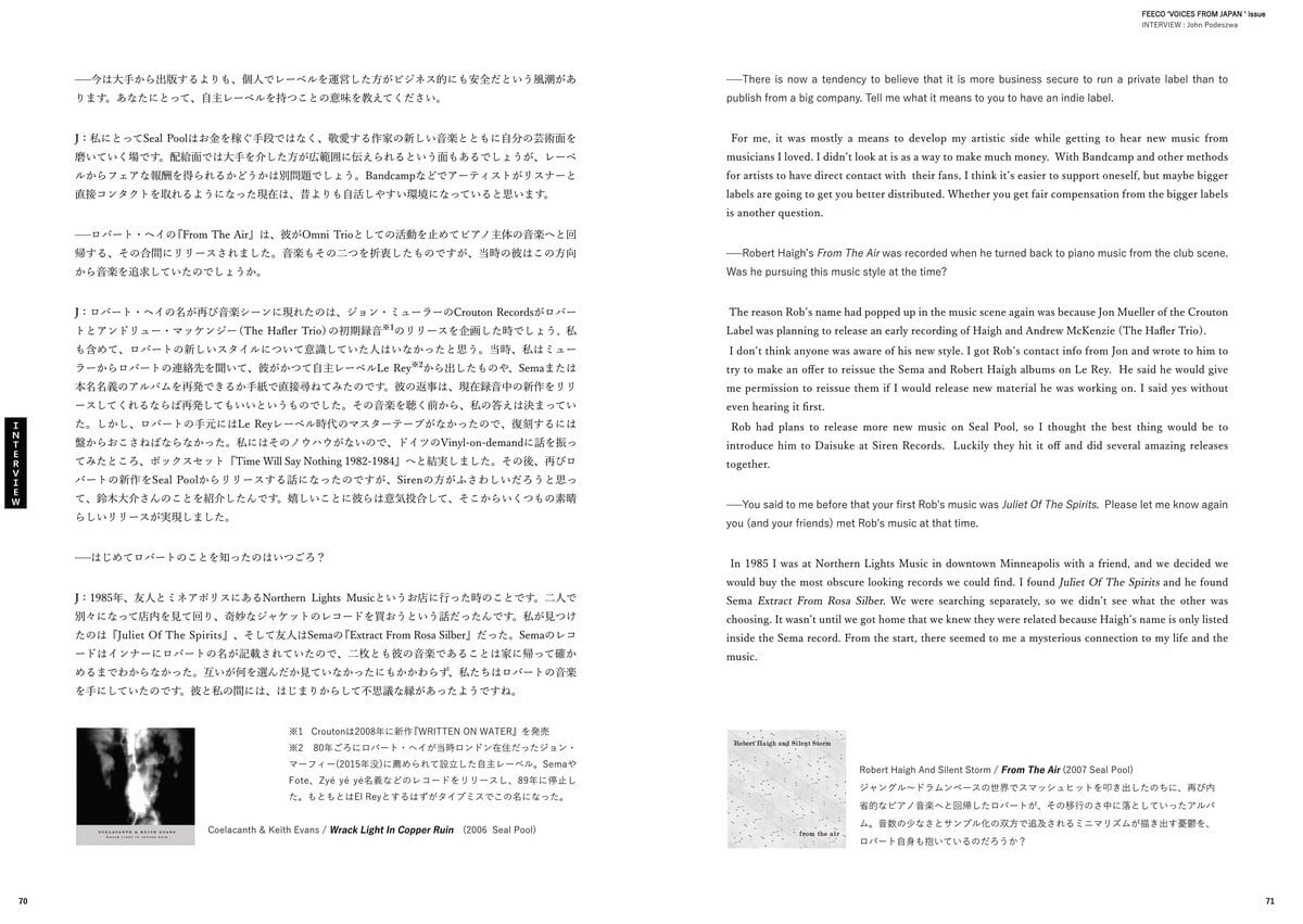 米独在住アーティストからコロナ禍中の生活を教えてもらった前号に続き、今号は日本在住者/日本発のインディ・アートを特集。寡黙な態度でSF的音響作品を日々録り続けるformer_airlineこと久保正樹と、自主レーベルSeal Poolのオーナーにして日本随一のNurse With Woundコレクターであるジョン・ポデズワの二人にインタビューを敢行。寄稿は久保正樹によるPhewのディケイド瞥見、前号にも登場したアーロン・ディラン・カーンズによる原田浩作品評、患者mono(SEGUE-4)によるquoree『鉛色の街』を例示したhyperpop~合成音声音楽論、溝口による"メモラビリア"漫画の4本立て。その他特集記事はThe Hairとあいさとう、完全自主運営インディ・バンドとしてのSCOOBIE DO(全アルバムレヴュー付)、加藤デビットホプキンズ『Rumors of Noizu』とフランスの復刻レーベルAnarchivesからみる日本アンダーグラウンド史と言説の輸出、プラグマティストとしての色川武大とボイド・ライス、21世紀になるとともに姿を消した音楽家シジマ、2012-2021の10年に生まれた日本発個人的音楽25選。