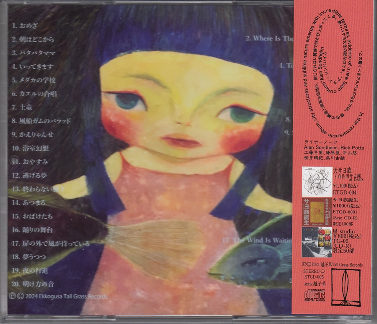ここには、わかりやすい、うた・リズム・メロディはありません。全てアコースティックの楽器/非楽器を用いたlo-fiな宅録による極めてユニークな音楽です。鳥、虫、汽笛、動物、赤ちゃん等の擬似笛や、篳篥、ギター、声、シンバル、銅羅、カリンバ、二胡等の民族楽器、百円ショップのオモチャ楽器、楽器以外の玩具に加え、擦る叩く置く物音や水音、ハサミ、マジックテープ、髪ブラシ…等の楽音/非楽音が同じ俎上で扱われ、スカスカでファニーなゆるしょぼ感を伴った、時におどろおどろしくも親しみ深い作品です。