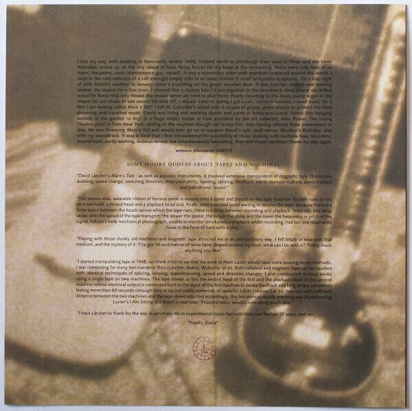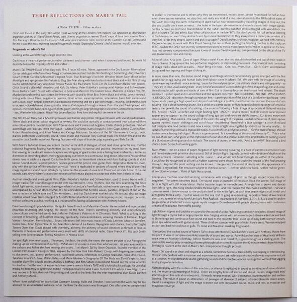 アンソニー・ムーアの旧友でスラップ・ハッピーやアンソニー・ソロ作のジャケット写真を手掛けた映像作家/写真家デヴィッド・ラーチャー(2023年死去)の1969年実験映画『Mare's Tail:牝馬のしっぽ』のサウンドトラックのためにアンソニーが初めてテープレコーダーを使って一人で制作した音源が初登場。