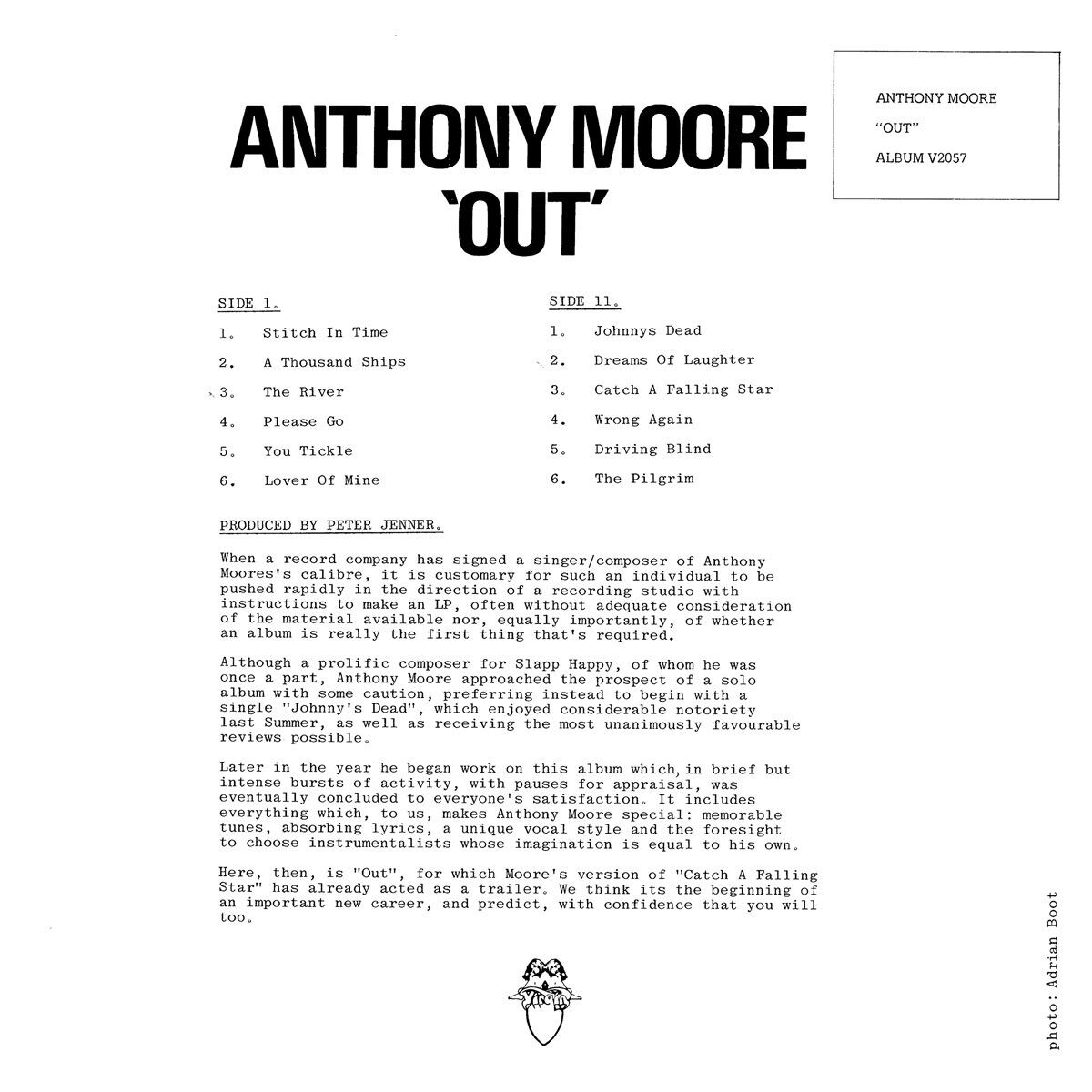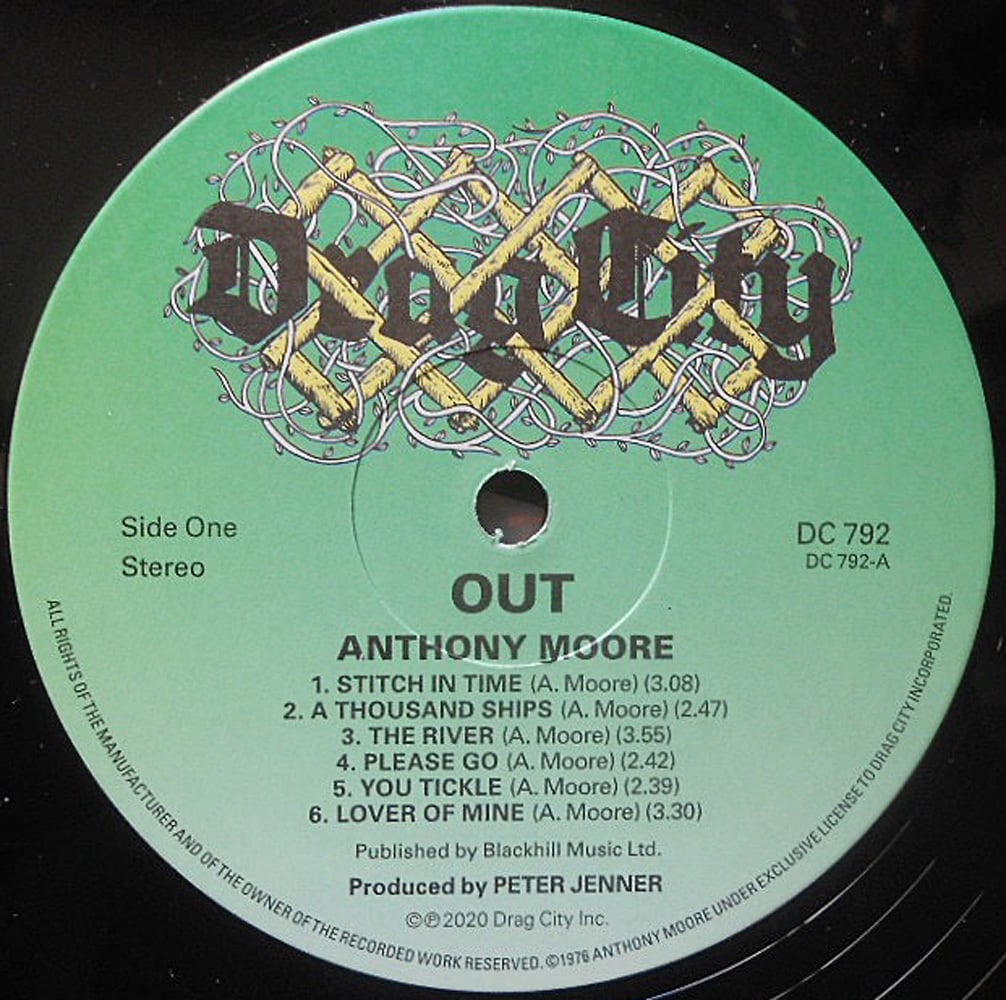 それが、1975 年の終わりにアンソニー・ムーアの頭のなかにあったひとつの考えだった。1975年の夏から76年の春にかけて、アンソニーはプロデューサーのピーター・ジェナー(ケヴィン・エアーズ、ロイ・ハーパー等)と、英国最高のミュージシャン、エンジニアたちとともに『アウト』を構成する12曲を生み出した。だが、巧みにアレンジされたポップ・ソングのクオリティの高さにもかかわらず、このプロジェクトは中止にされてしまった。